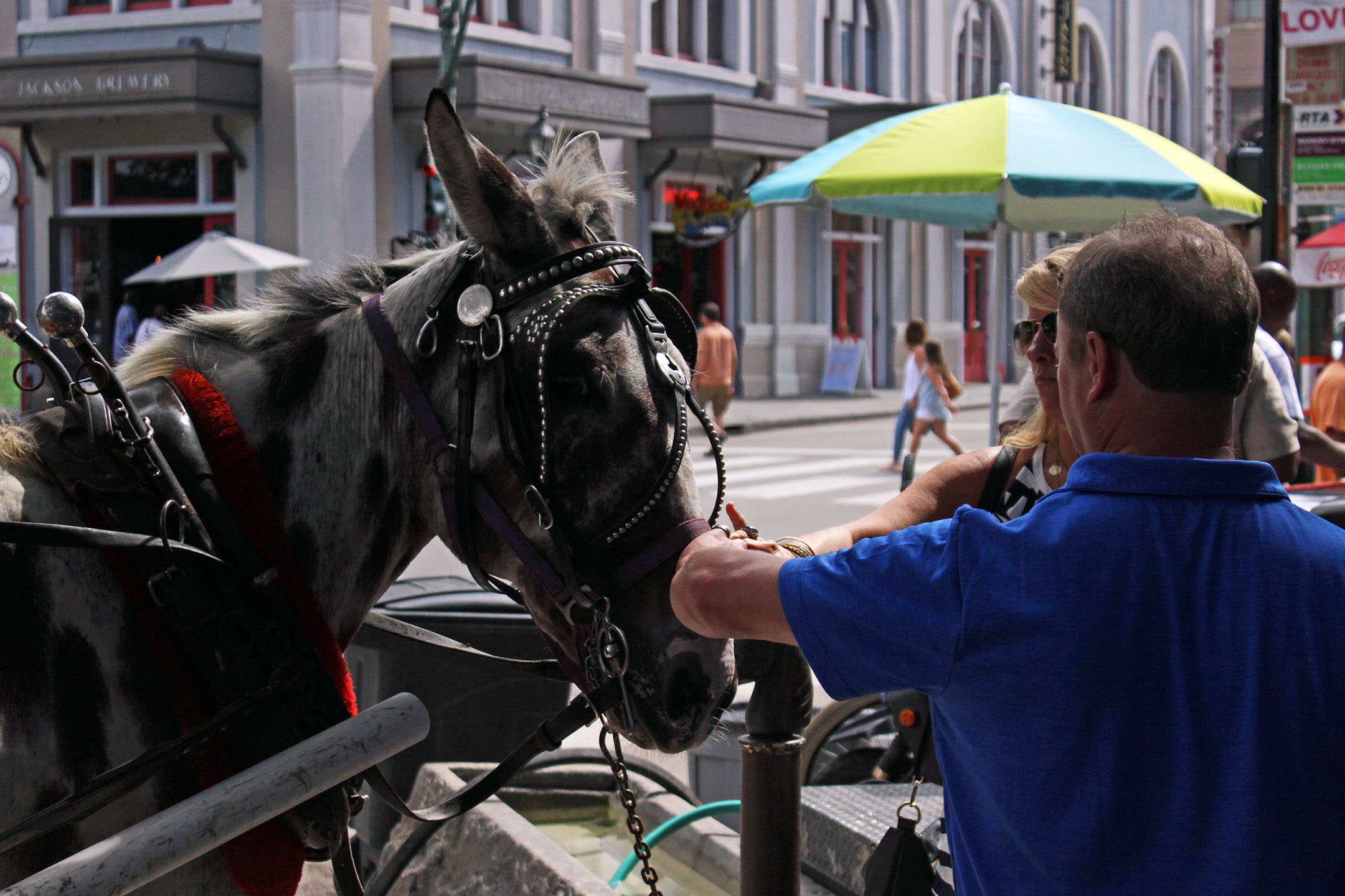 When visiting the French Quarter, many people take a tour of the area on horse drawn carriages. Each carriage has one or two horses pulling it.
