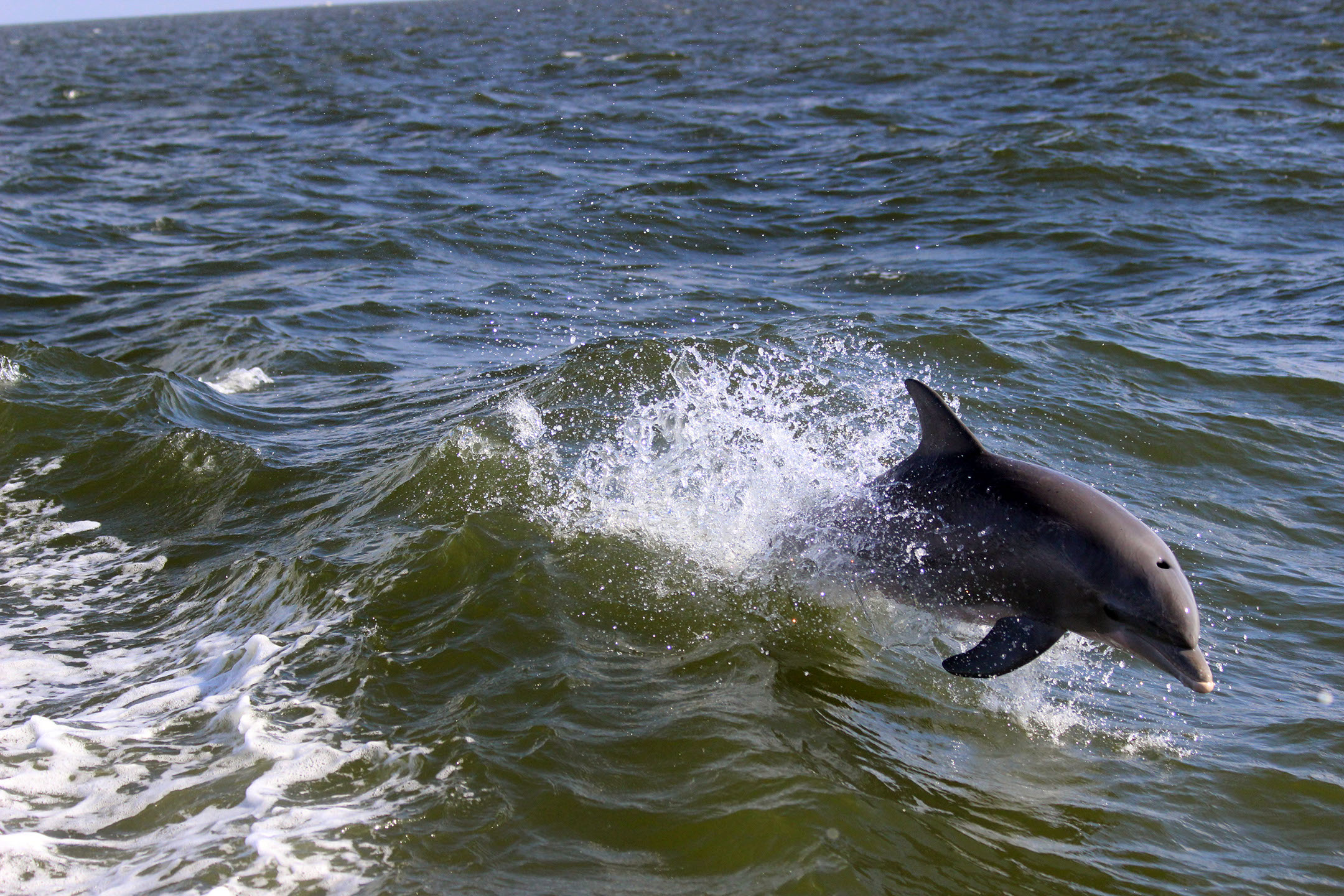 Dolphins, like the birds, have begun following boats into the Gulf in order to catch the fish that are brought up in the boat’s wake. This can be extremely dangerous for dolphins, however, as they could be hit by the blades of the boat’s motor if they get too close.